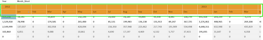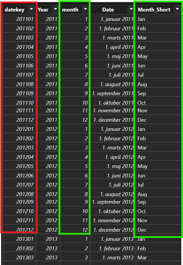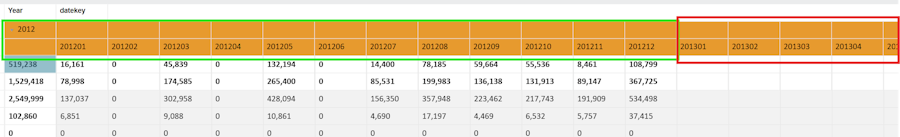 To avoid having more than 12 months per year, you need to establish a naming logic that reflects the relationship between years and months. In this case, do not use a combined description for month and year (e.g., "January 20217"); instead, just use "January" for the month. The green options below will work, but the red options will generate a column for each unique "datekey" for every year.