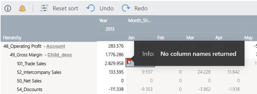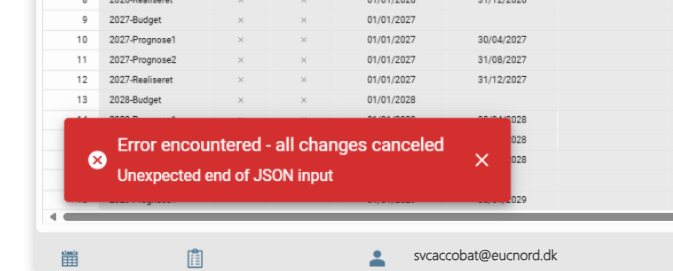 "Error encountered - all changes canceled Unexpected end of JSON input" ![]() | Often a result of a wrong connection information for the writeback database/tabel in accoMASTERSDATA. | Revisit your connection information in the connection tab of the formating area of the visual. (Server Name, database Name, Username, password, schema, Writeback tabel name) Try to reenter the information and/or try to connect to the database and table though Microsoft Management studio to verify if the connection information is valid |