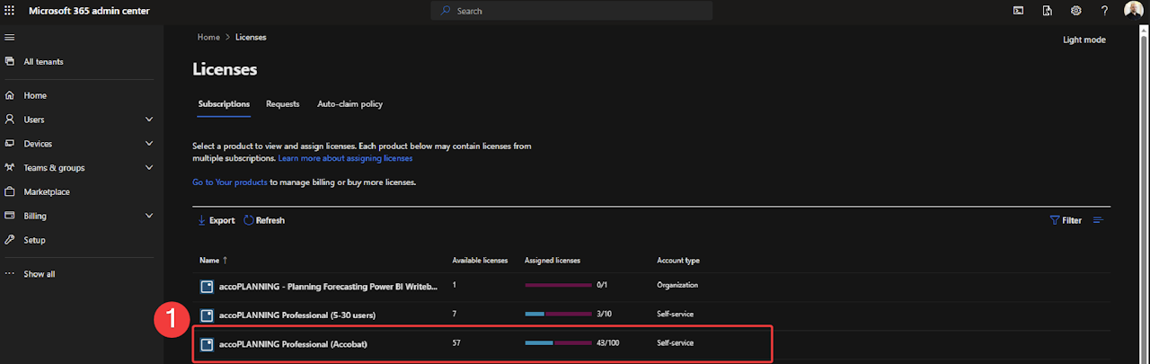 Navigate to the licenses section in Microsoft 365 Admin Center: